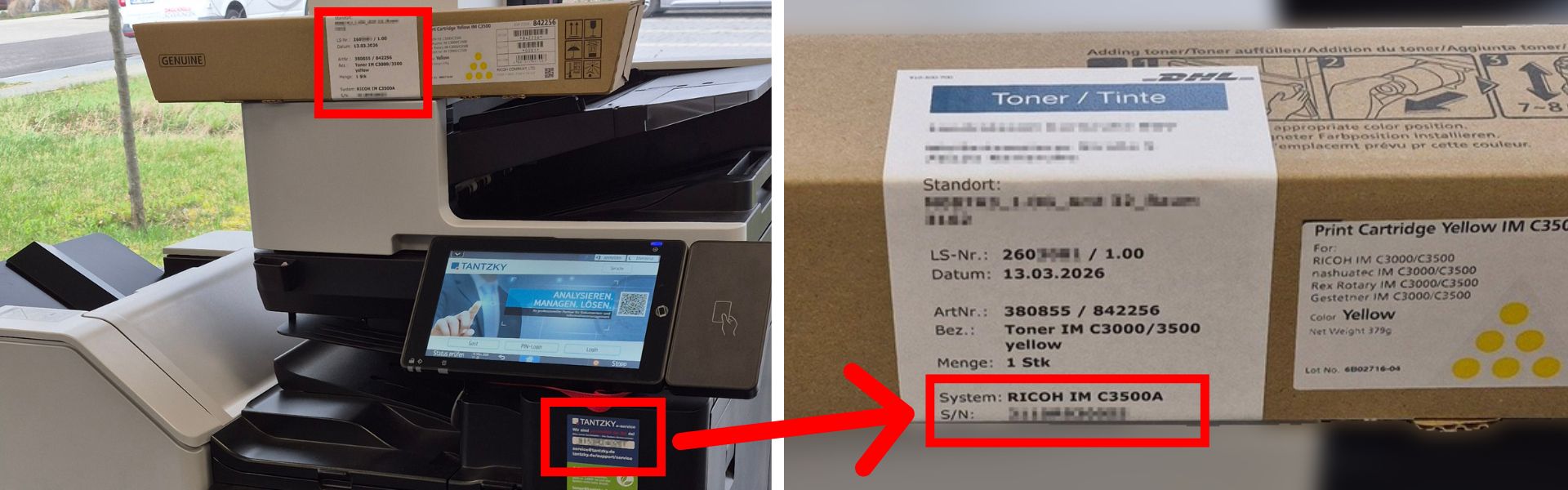 Ab sofort finden Sie auf allen TANTZKY Toner- und Tintensendungen, auf dem Aufkleber die direkte Zuordnung zum System mit Seriennummer und dessen Standort.